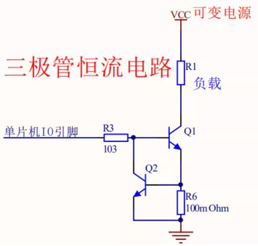 当Q2三极管导通,Q1三极管基级电压被拉低而截止,负载R1不工作;负载R1流过的电流等于R6电阻的电流(忽略Q1与Q2三极管的基级电流),R6电阻的电流等于R6电阻两端的0.6~0.7V电压除以R6电阻阻值(固定不变),因此流过R1负载的电流即为恒定不变,即使R1负载的电源端VCC电压是可变的,也能达到恒流的电路效果。