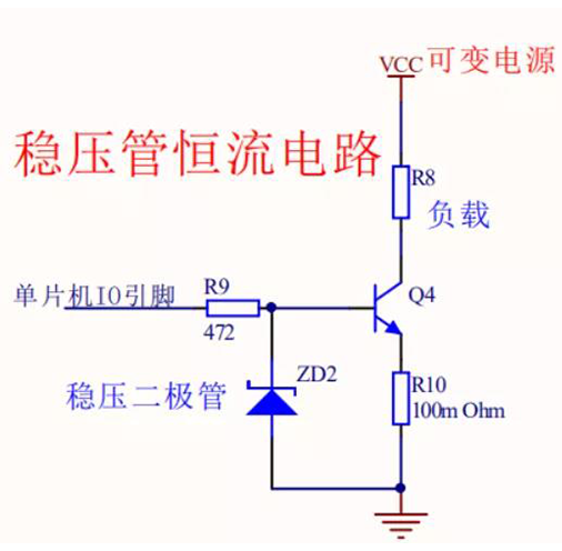 稳压二极管的恒流电路中,三极管Q4的基级电压被限定在稳压二极管工作的稳定电压Uzd下,因此R10电阻的电压等于Uzd减去三极管基级与发射级的导通压降0.7V,即U=Uzd-0.7保持恒定不变,所以流过R10电阻的电流在VCC电源即使可变的条件下也是固定不变,也就是R8负载的电流保持不变,达到恒流的效果。