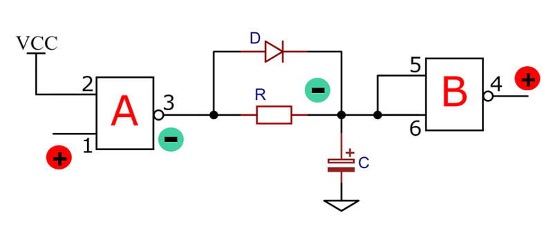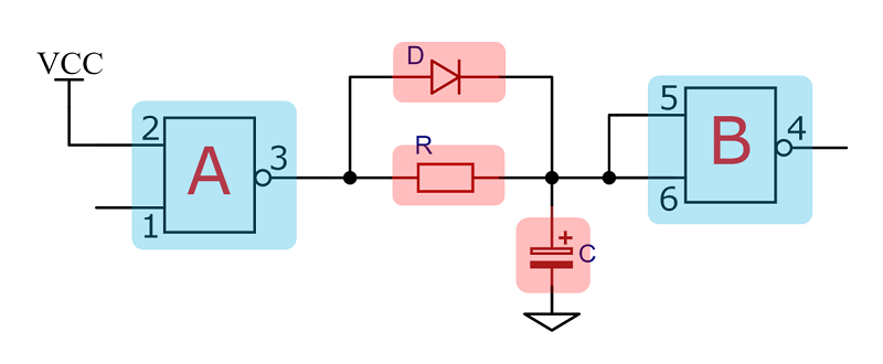 图5为电路原理图,它由两个与非门外加阻容器件串联而成。