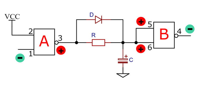 当我们给第1引脚一个低电平,也就是喂狗的时候,A与非门输出高电平,此时电容C两端开始充电。同时,与非门B的两个输入端电平为高,那么输出端第4引脚就为低电平,不产生复位动作。如图6.