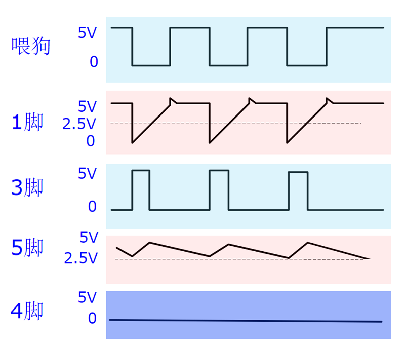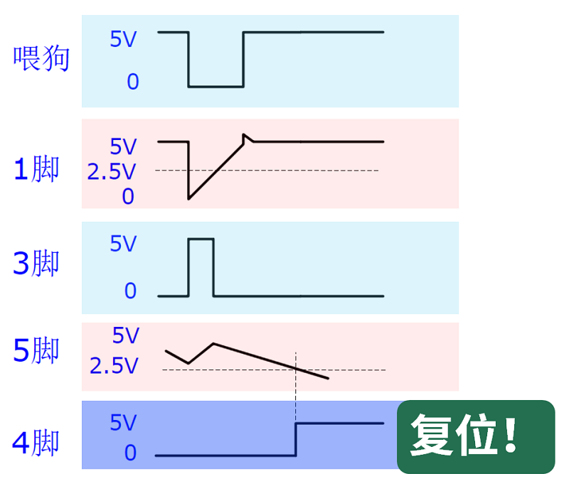 我们需要操作的是在电容C放电至阈值的时间段内给第1引脚一个低电平,也就是喂狗操作,保证第4引脚持续输出低电平,这样就实现了看门狗对电路的监控功能。如图9.