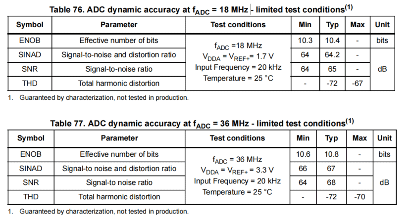 在使用内置ADC的时候,我们要注意datasheet中相关的内容,比如下面这个表里的表示ADC动态性能参数,ENOB代表的是有效位数,SIAND信号与噪声失真比。
